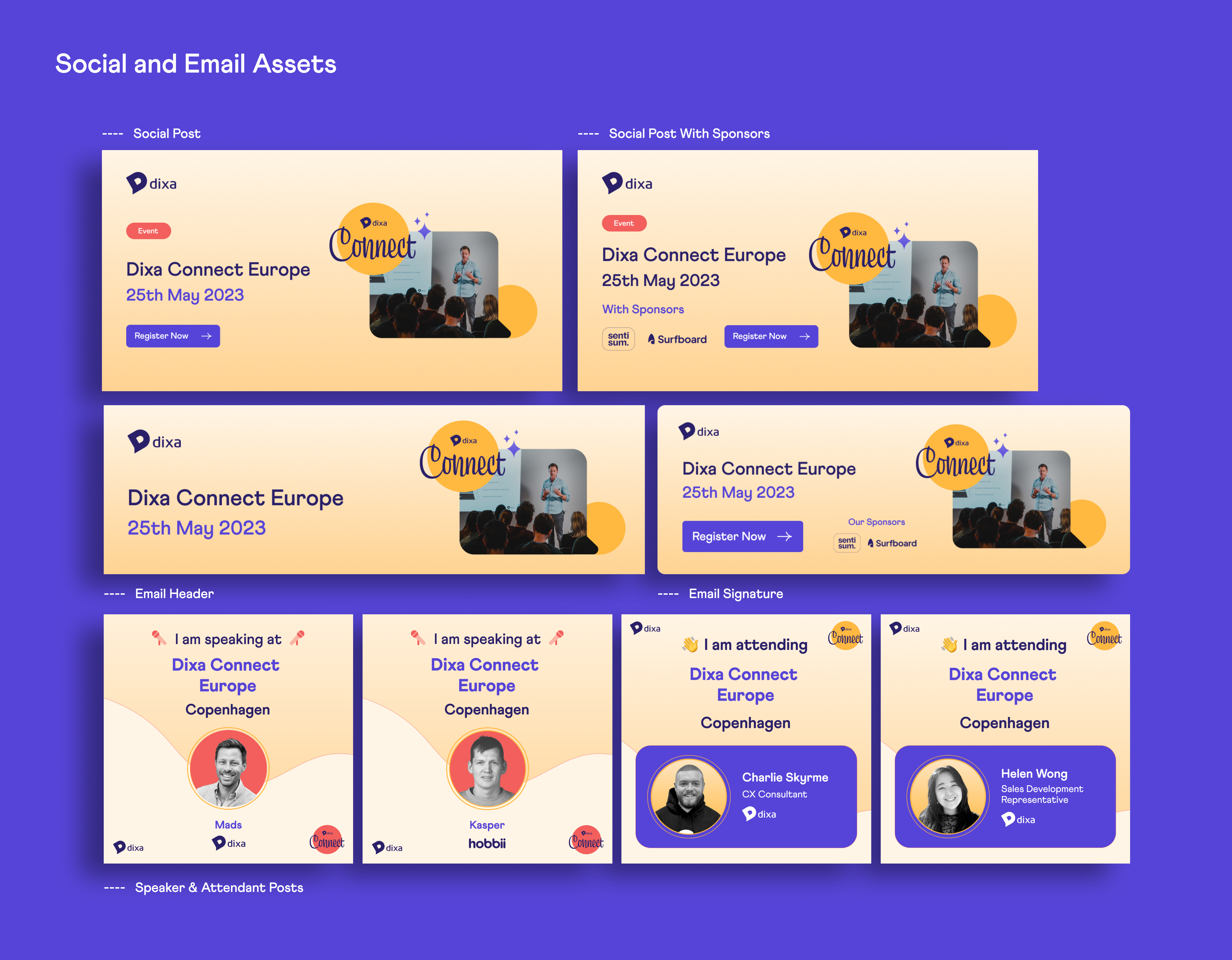Dixa runs a mix of webinars, local meetups, and the annual Dixa Connect conference to grow brand awareness and drive pipeline. Each format needs cohesive, on-brand assets that perform online and hold up in real-world settings. As Brand Designer, I built a scalable event asset system for Dixa, covering the flagship Dixa Connect conference plus 19+ meetups & webinars, from digital promos to on-site collateral, contributing to 750+ attendees, 246 registrations, and 70 qualified leads across the program.